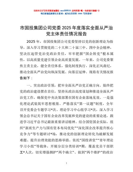 / 市国投集团公司党委2025年度落实全面从严治党主体责任情况报告