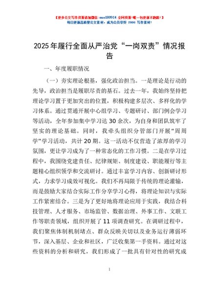 / 2025年履行全面从严治党“一岗双责”情况报告