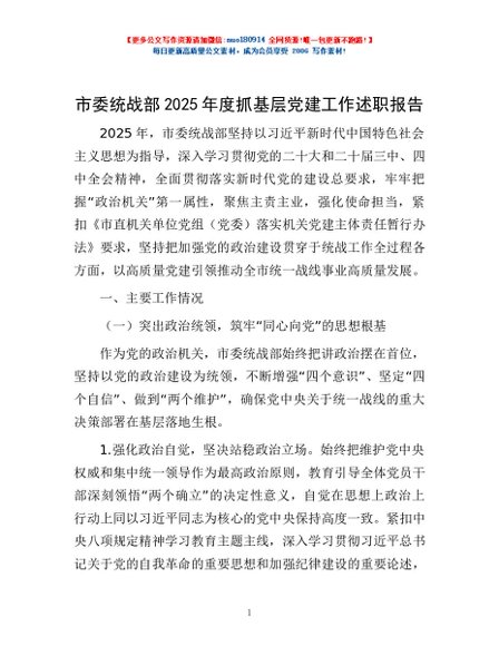 / 市委统战部2025年度抓基层党建工作述职报告