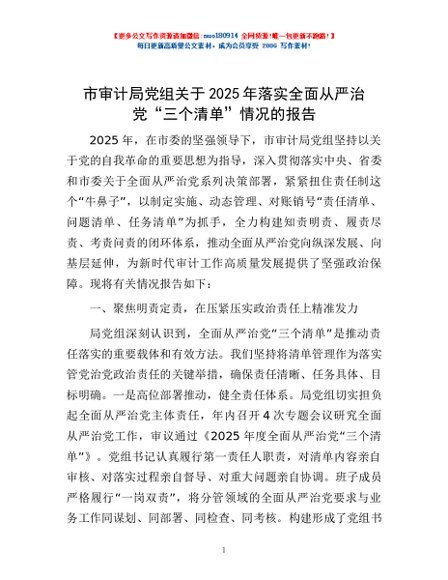 / 市审计局党组关于2025年落实全面从严治党“三个清单”情况的报告