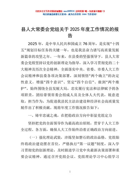 / 县人大常委会党组关于2025年度工作情况的报告