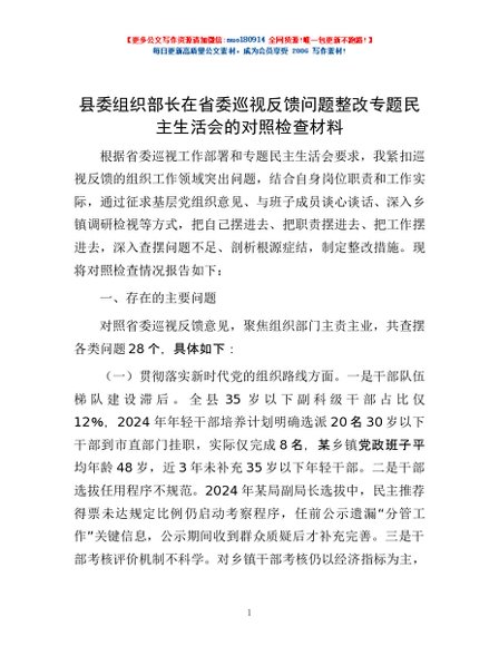 / 县委组织部长在省委巡视反馈问题整改专题民主生活会的对照检查材料