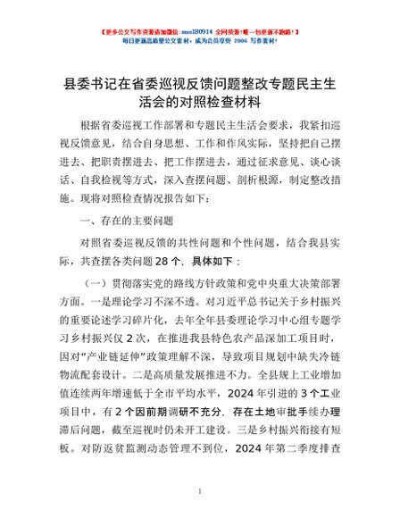/ 县委书记在省委巡视反馈问题整改专题民主生活会的对照检查材料