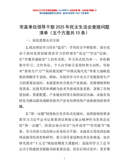 / 市直单位领导干部2025年民主生活会查摆问题清单(五个方面共15条)