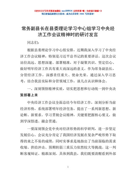 / 常务副县长在县委理论学习中心组学习中央经济工作会议精神时的研讨发言