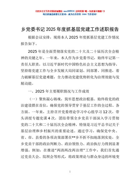 / 乡党委书记2025年度抓基层党建工作述职报告