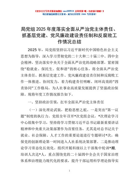 局党组2025年度落实全面从严治党主体责任、抓基层党建、党风廉政建设责任制和反腐败工作情况总结
