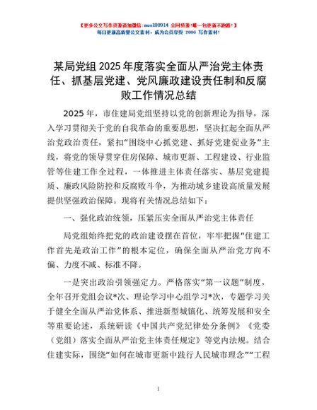/ 某局党组2025年度落实全面从严治党主体责任、抓基层党建、党风廉政建设责任制和反腐败工作情况总结