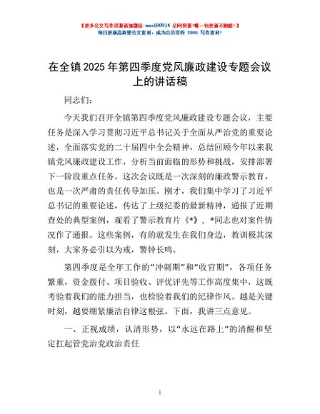 / 在全镇2025年第四季度党风廉政建设专题会议上的讲话稿