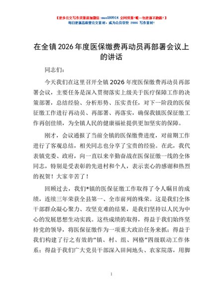 / 在全镇2026年度医保缴费再动员再部署会议上的讲话