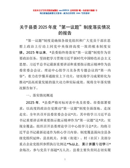 / 关于县委2025年度“第一议题”制度落实情况的报告