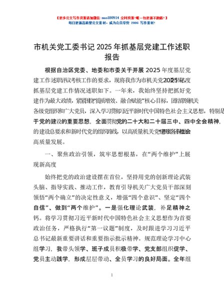 / 市机关党工委书记2025年抓基层党建工作述职报告