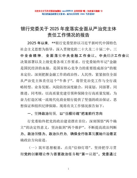 / 银行党委关于2025年度落实全面从严治党主体责任工作情况的报告