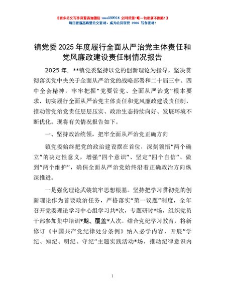 / 镇党委2025年度履行全面从严治党主体责任和党风廉政建设责任制情况报告