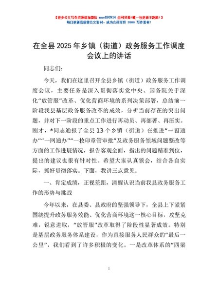 / 在全县2025年乡镇(街道)政务服务工作调度会议上的讲话