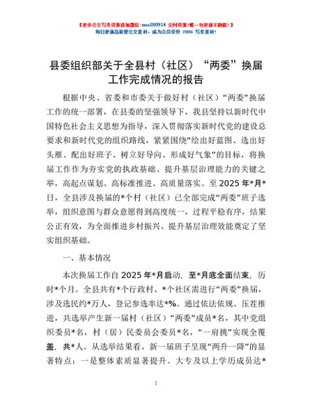 / 县委组织部关于全县村(社区)“两委”换届工作完成情况的报告