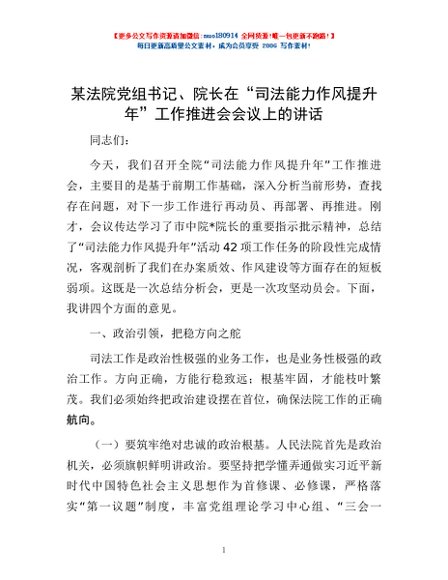 / 某法院党组书记、院长在“司法能力作风提升年”工作推进会会议上的讲话