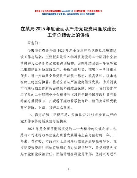/ 在某局2025年度全面从严治党暨党风廉政建设工作总结会上的讲话