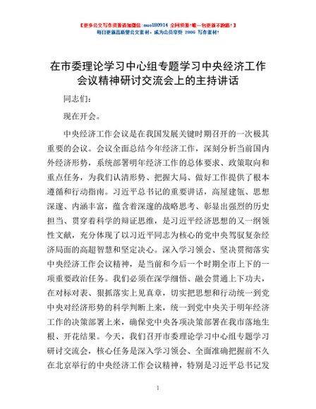 / 在市委理论学习中心组专题学习中央经济工作会议精神研讨交流会上的主持讲话