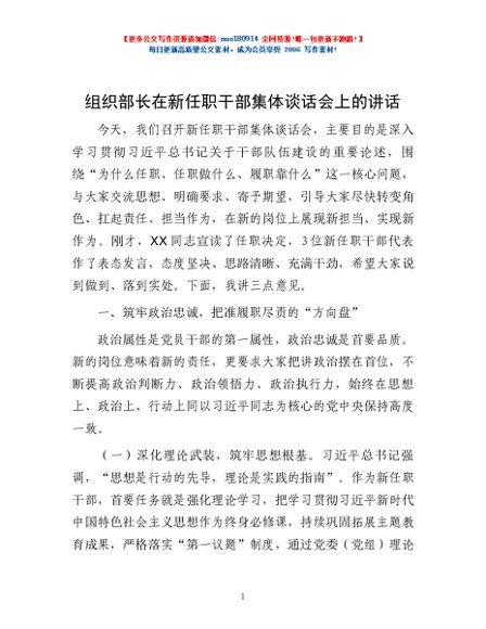 / 组织部长在新任职干部集体谈话会上的讲话