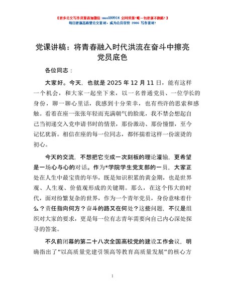 / 党课讲稿:将青春融入时代洪流在奋斗中擦亮党员底色