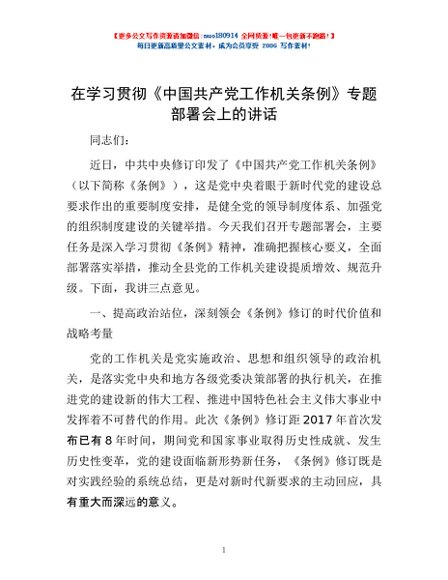 / 在学习贯彻《中国共产党工作机关条例》专题部署会上的讲话