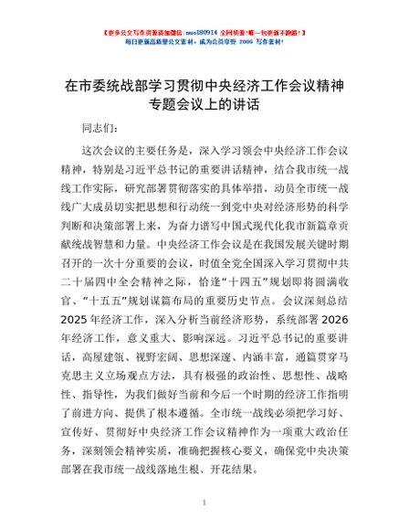 / 在市委统战部学习贯彻中央经济工作会议精神专题会议上的讲话
