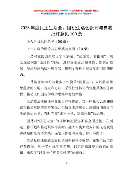 / 2025年度民主生活会、组织生活会批评与自我批评意见100条