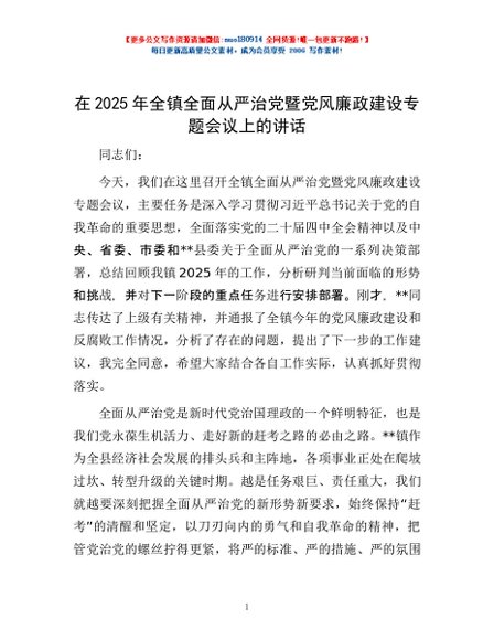 / 在2025年全镇全面从严治党暨党风廉政建设专题会议上的讲话