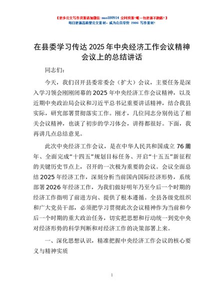 / 在县委学习传达2025年中央经济工作会议精神会议上的总结讲话