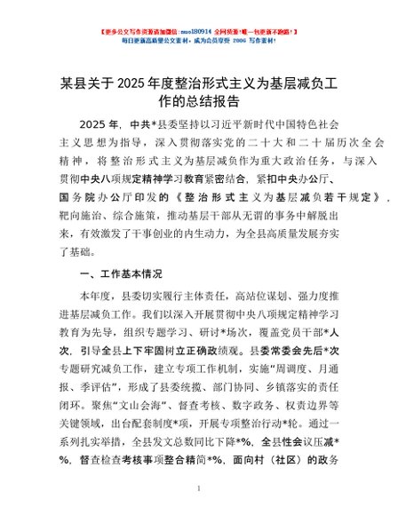 / 某县关于2025年度整治形式主义为基层减负工作的总结报告