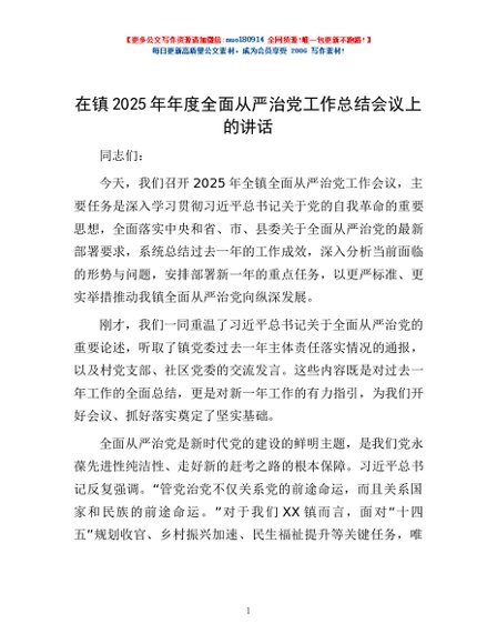 / 在镇2025年年度全面从严治党工作总结会议上的讲话