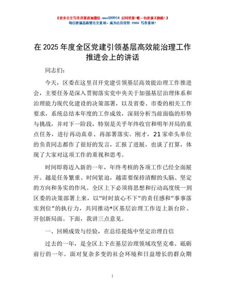 / 在2025年度全区党建引领基层高效能治理工作推进会上的讲话