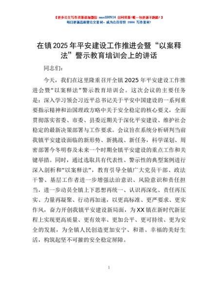 / 在镇2025年平安建设工作推进会暨“以案释法”警示教育培训会上的讲话