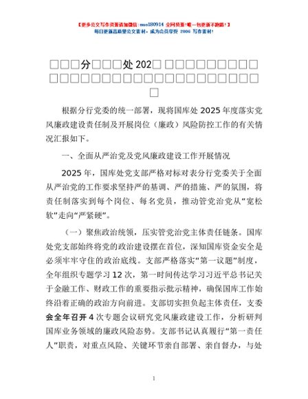 / 银行省分行国库处2025年度党风廉政建设责任制落实及岗位(廉政)风险防控检查情况报告