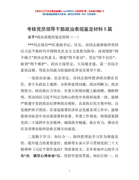 / 考核党员领导干部政治表现鉴定材料5篇