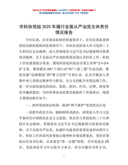/ 市科协党组2025年履行全面从严治党主体责任情况报告