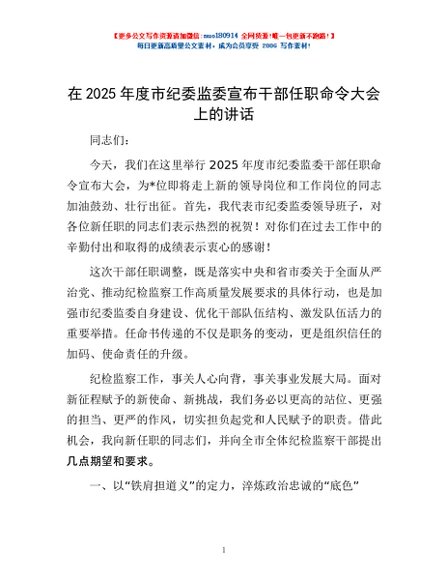 / 在2025年度市纪委监委宣布干部任职命令大会上的讲话