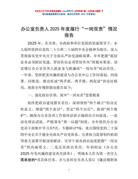 / 办公室负责人2025年度履行“一岗双责”情况报告