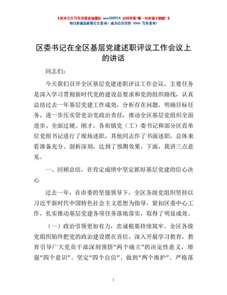 / 区委书记在全区基层党建述职评议工作会议上的讲话
