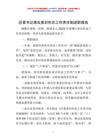 / 区委书记落实意识形态工作责任制述职报告