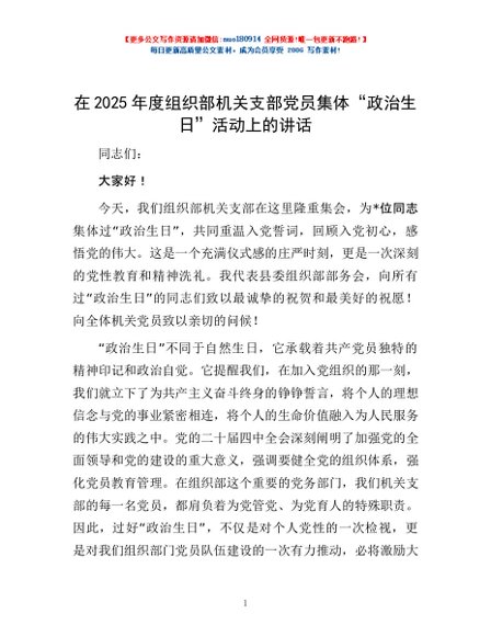 / 在2025年度组织部机关支部党员集体“政治生日”活动上的讲话
