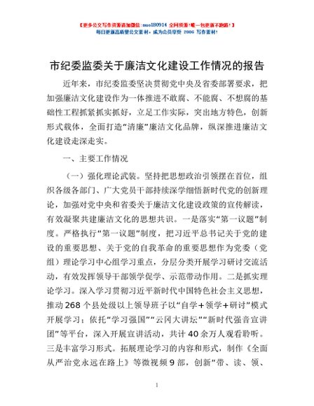 / 市纪委监委关于廉洁文化建设工作情况的报告