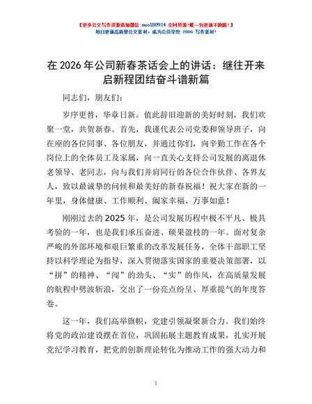 / 在2026年公司新春茶话会上的讲话:继往开来启新程 团结奋斗谱新篇