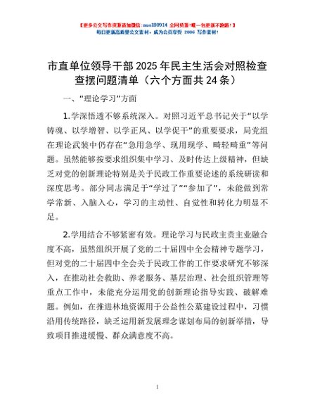 / 市直单位领导干部2025年民主生活会对照检查查摆问题清单(六个方面共24条)
