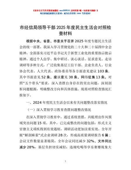 / 市经信局领导干部 2025 年度民主生活会对照检查材料