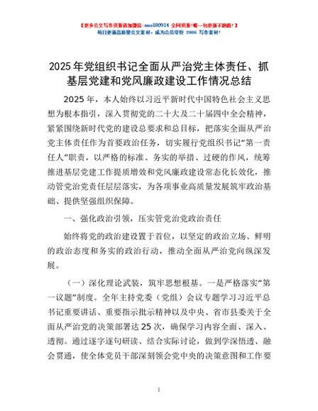 / 2025年党组织书记全面从严治党主体责任、抓基层党建和党风廉政建设工作情况总结