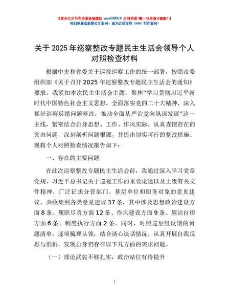 / 关于2025年巡察整改专题民主生活会领导个人对照检查材料