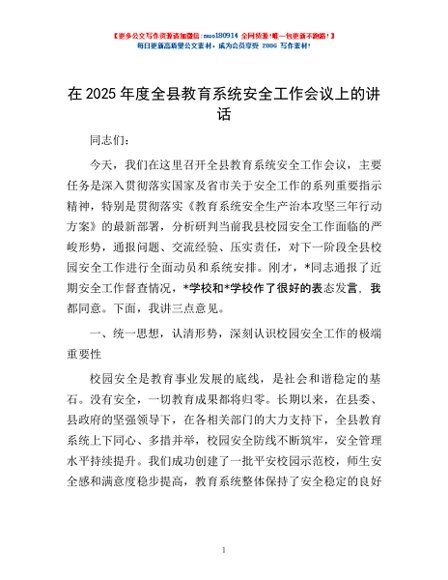 / 在2025年度全县教育系统安全工作会议上的讲话