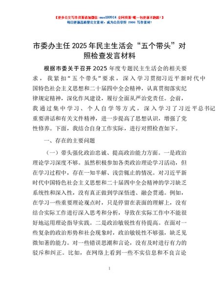 / 市委办主任2025年民主生活会“五个带头”对照检查发言材料